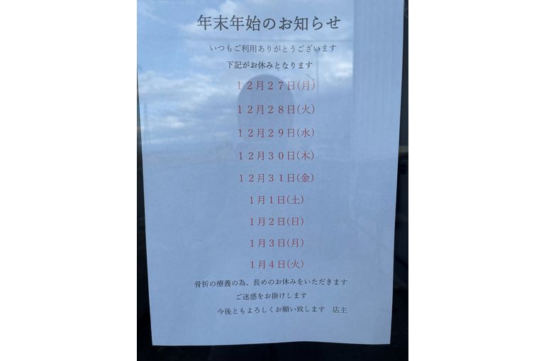 骨折の療養の為、長めの店休になることを